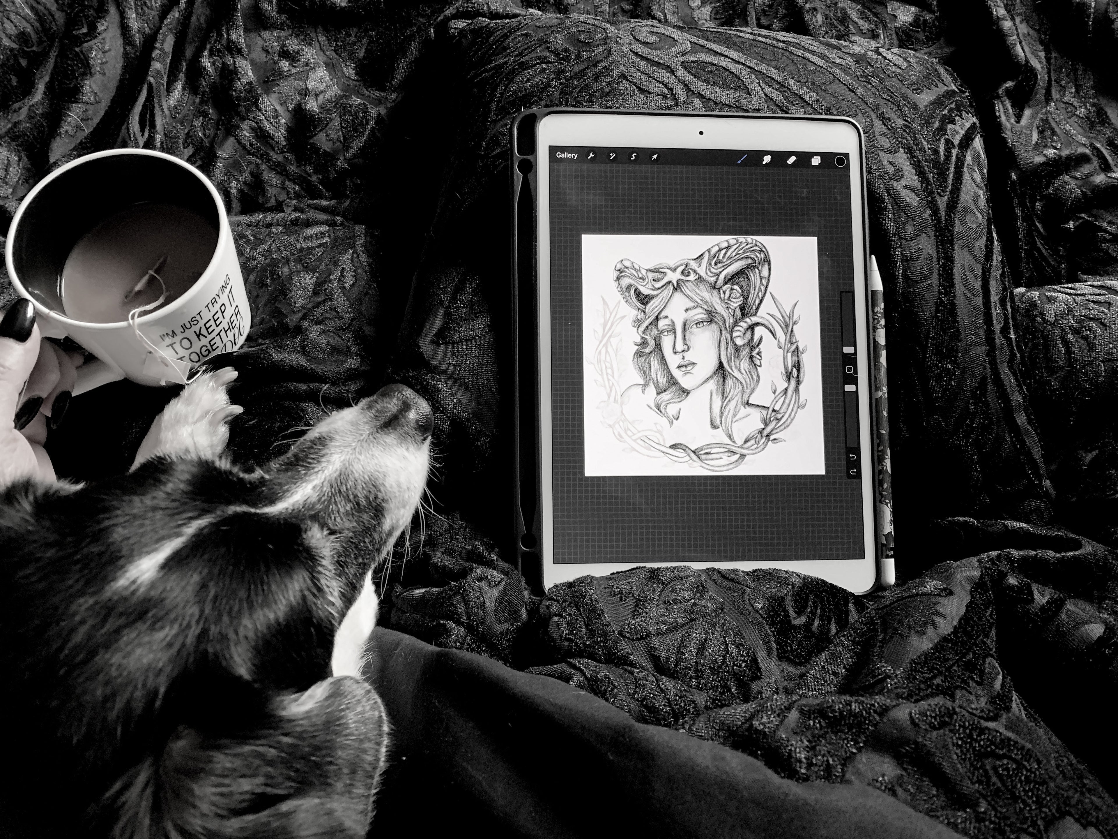 I’ve been residing in Washington state since the summer of 2021 with my betrothed, my bonus daughter, and our two fur babies: Thor, our dramatic 14-year-old hound, and Schrödinger, the theoretical cat of ambiguous status. Originally from the barren deserts of Arizona, I blossomed as an introverted individual who finds joy in creating with Thor by my side, a cup of chai tea, and sweet melodies in the background, especially when rain gently taps on the windows. My greatest joy comes from creating what doesn’t exist in reality—bringing to life the visions that dwell solely in my mind.